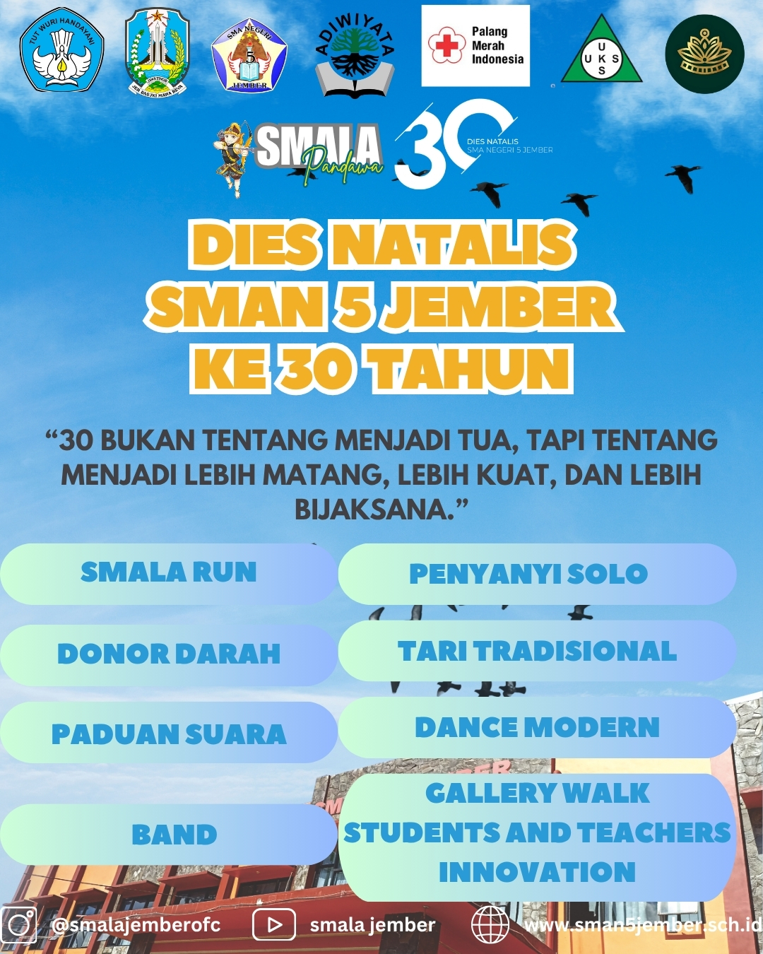 25 Oktober 2025 adalah hari jadi SMAN 5 Jember ke 30 Tahun. Dan banyak kegiatan yang di adakan di sekolah dalam rangka merayakan hari jadi ke 30 Tahun ini. 30 Tahun bukan lah hanya sekedar angka, namun 30 juga menunjukan jalan panjang yang sudah di lalui. Kedepannya akan lebih banyak lagi perjalan yang akan kami tempuh dalam mendidik anak bangsa.